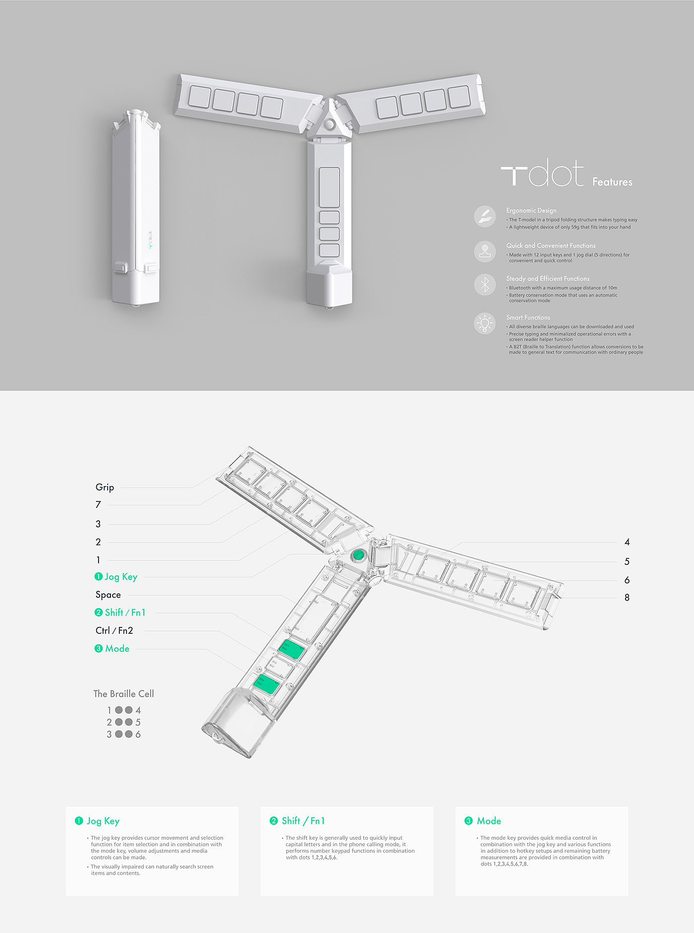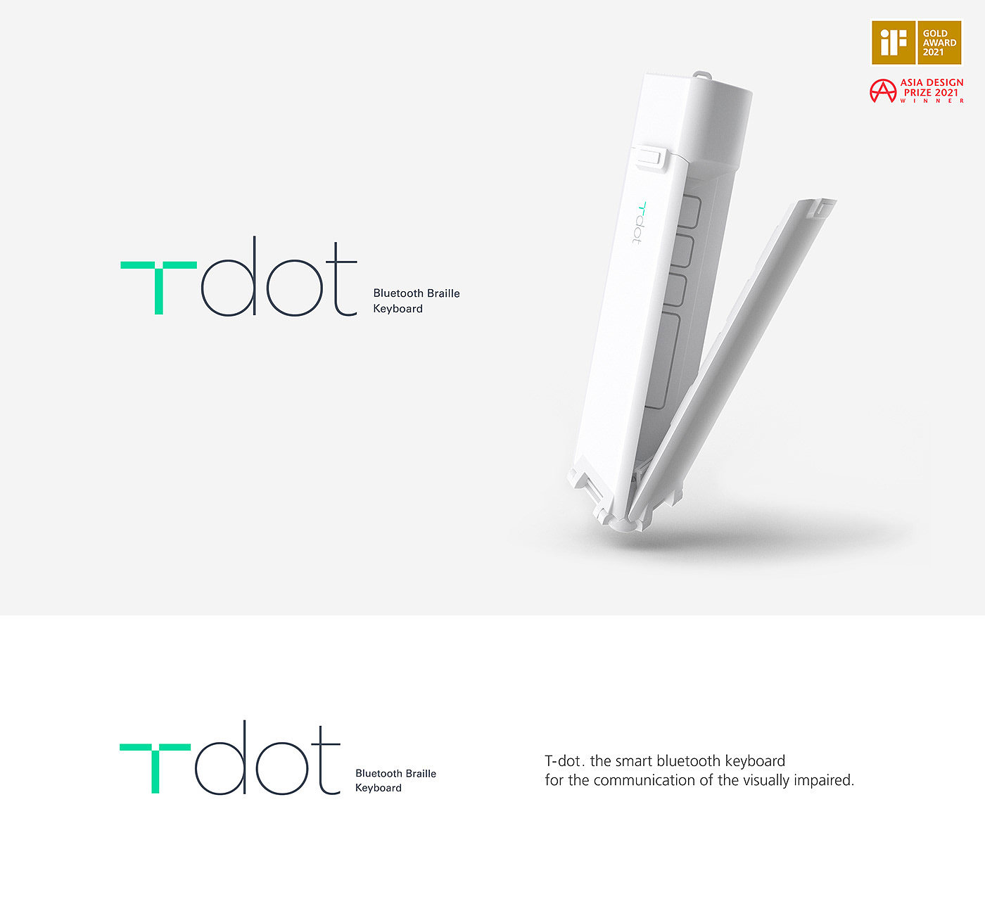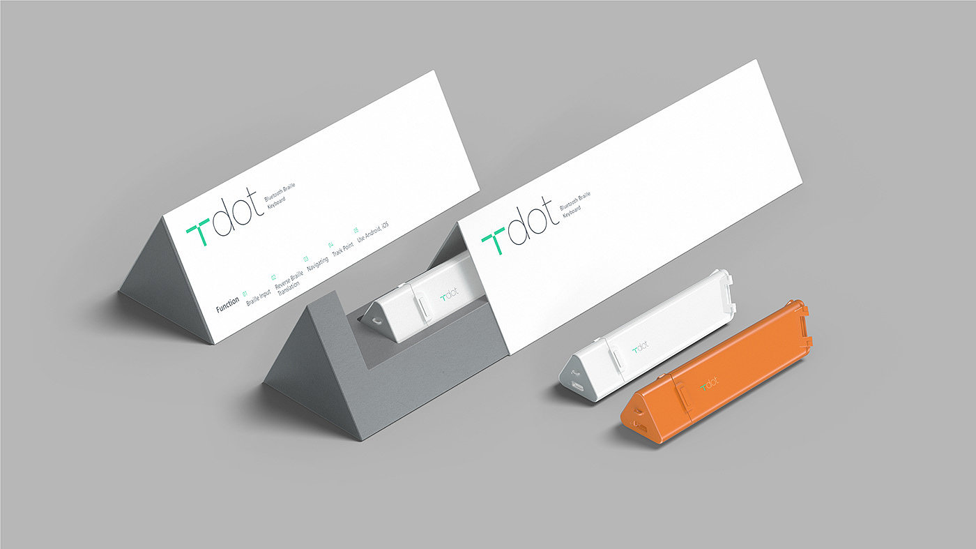 T-dot 是一款IF奖获奖设计,其为一款专为盲人而设计的蓝牙键盘设计,与传统键盘设计不同,这是盲文蓝牙键盘,它足够小巧便携,采用T型人体工学设计。键盘重量59G,方便盲人用户群体使用。