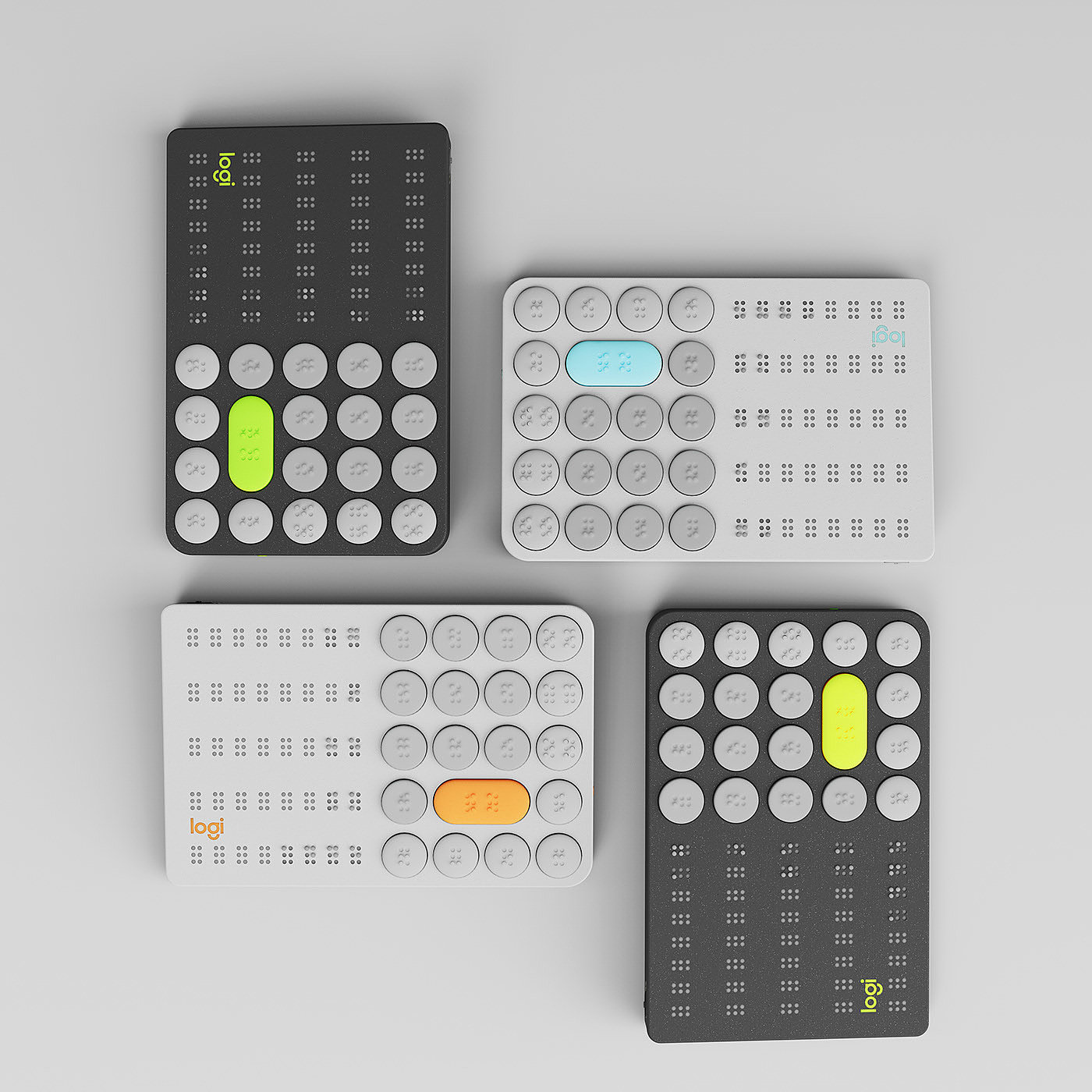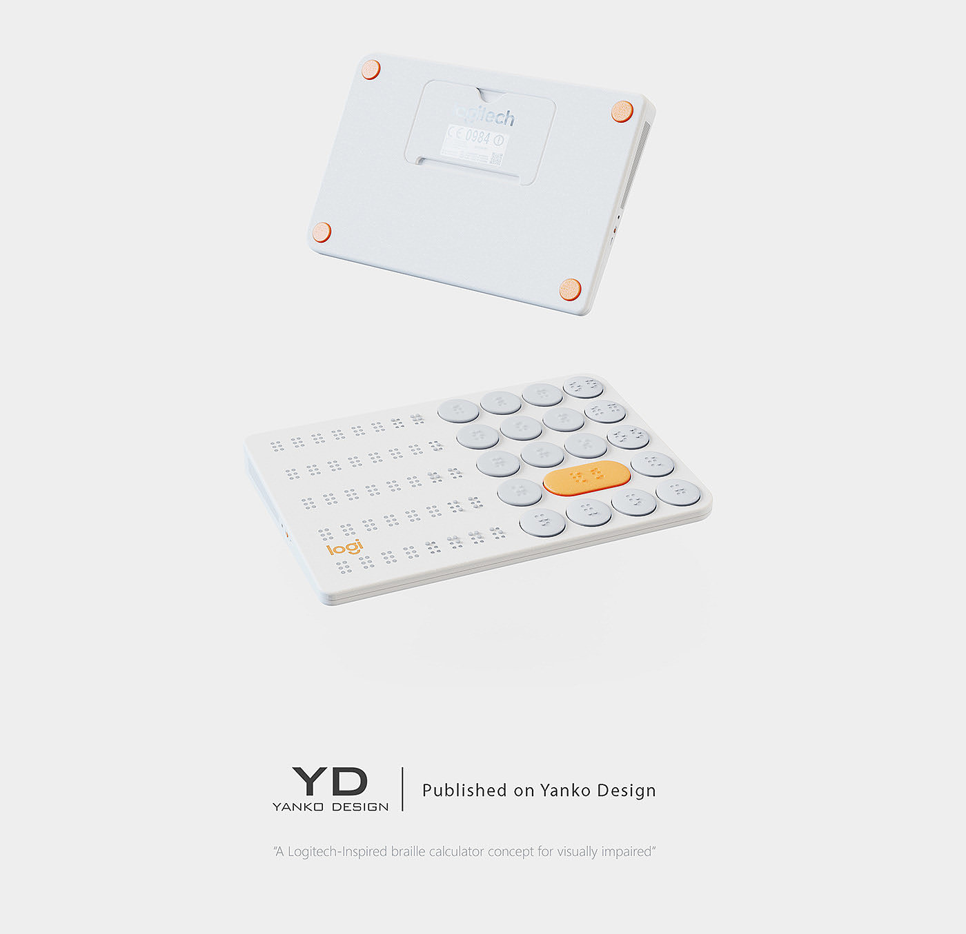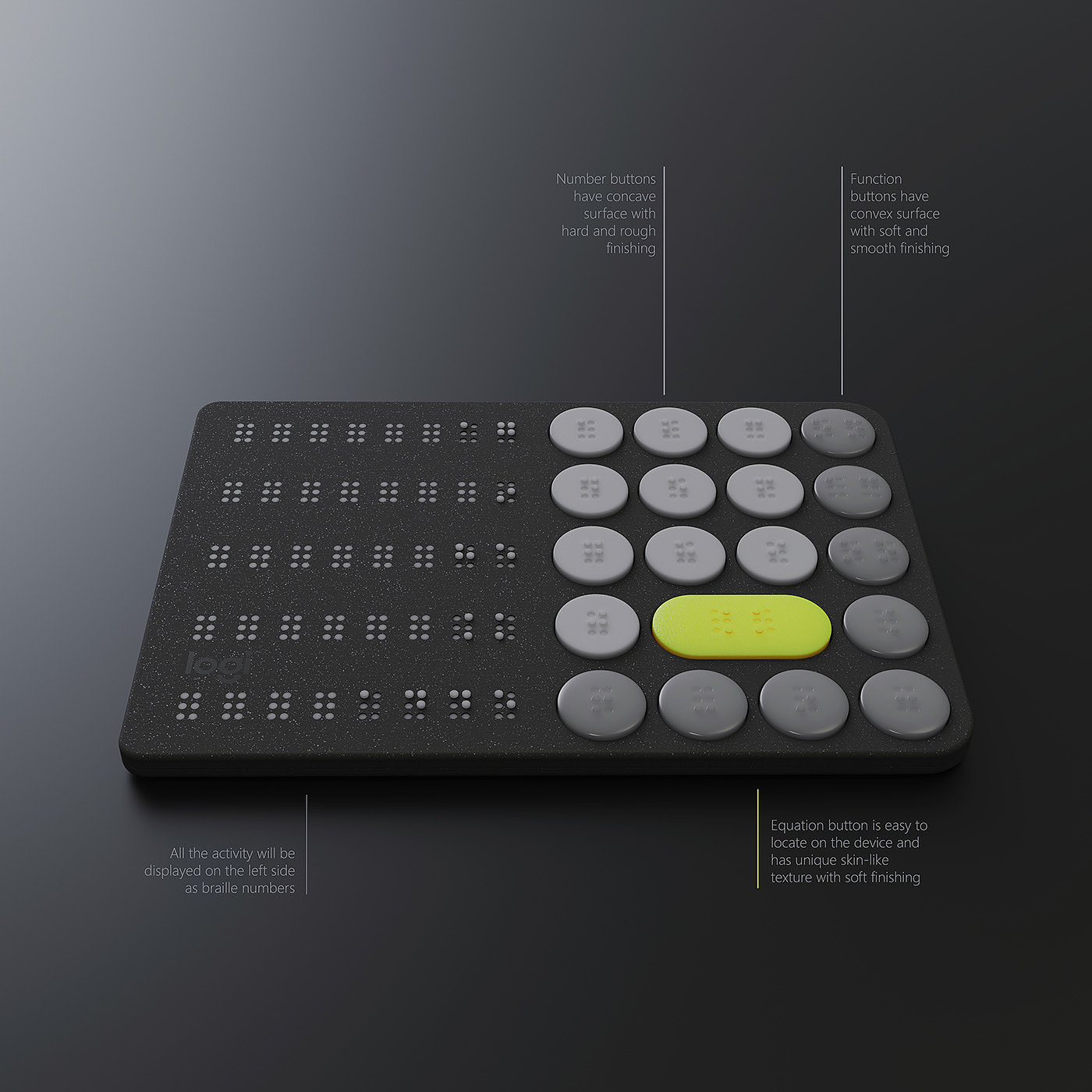 Logitech 是一款概念计算器产品设计,其是专为盲人设计而打造的盲文计算器产品,设计原理是通过触觉感知,其计算器产品具有很强的触觉效果,源于设计师每组按钮都设计有自己独特的表面处理。