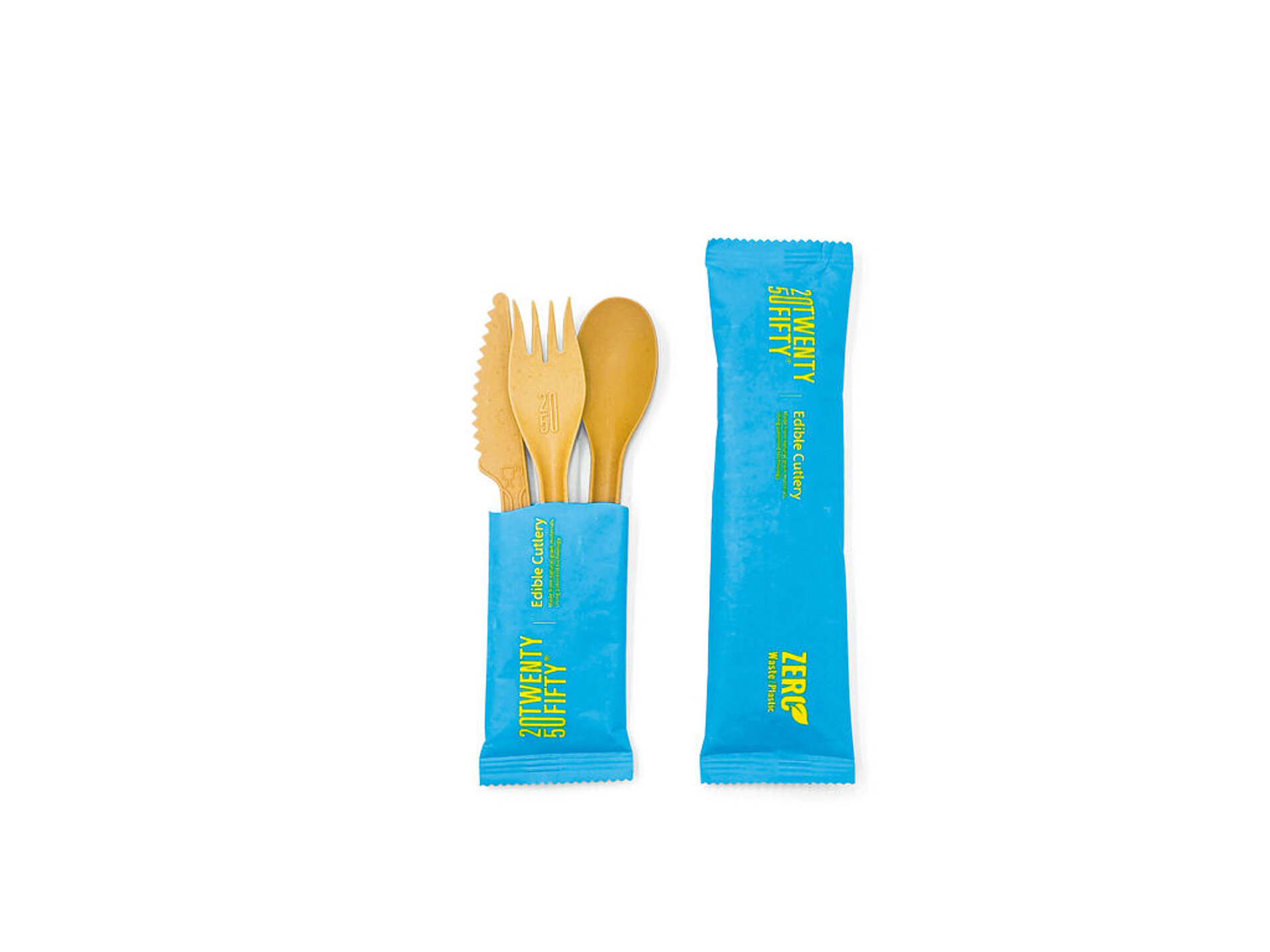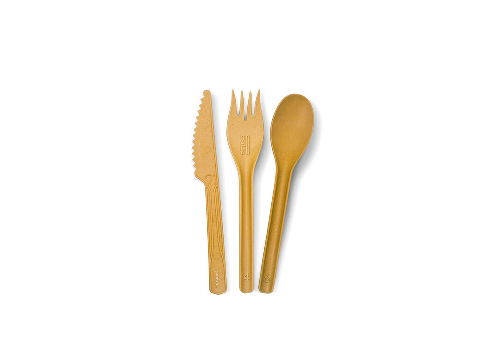 一套环保餐具设计,仅使用天然原材料:米糊凝块、大豆蛋白和木薯淀粉。这些原材料作为农业副产品大量存在,并且不与主食的生产竞争。餐具套装采用节能的热熔注塑工艺生产,不使用任何化学溶剂,而且产品在未开封的包装下可保存两年。