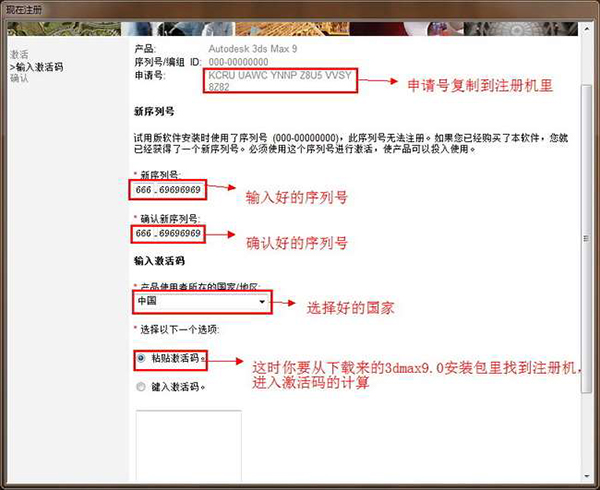 9、输入序列号:629-12382931或666-66666666或666-69696969,选择国家为中国,选择“粘贴激活码”。