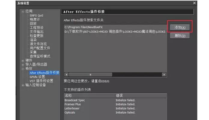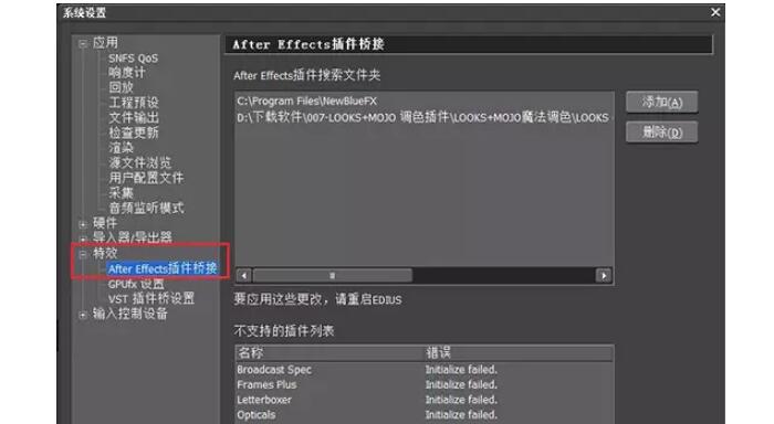 在系统设置对话窗口里面依次点击“特效”——“AfterEffects插件桥接"