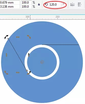 依照上步操作,再次将直线按快捷键Ctrl+C复制,再按CtrL+V粘贴一份,输入旋转角度为240度,按Enter确定,这样就把一个圆环平均分为三等份了。