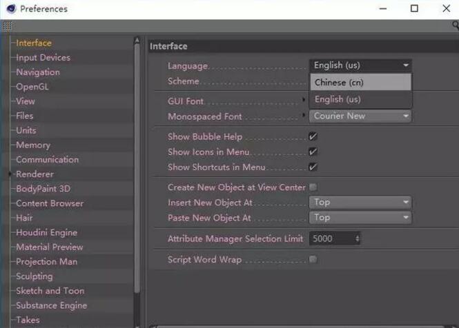 首次安装完C4D,启动后是英文界面,在“编辑”菜单下打开设置,或使用快捷键“ctrl+e"打开设置界面,修改中文语言和字体大小。