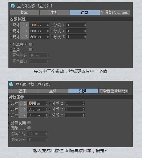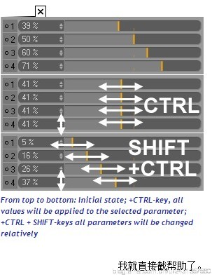12、同时设置多重数值(浮点滑块型数值),选中参数,按住ctrl键拖拉,能同时设置相同的值,按住ctrl+shift拖拉能保持相对位置同时设置多重数值