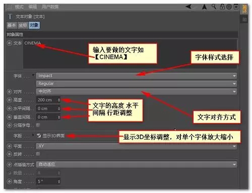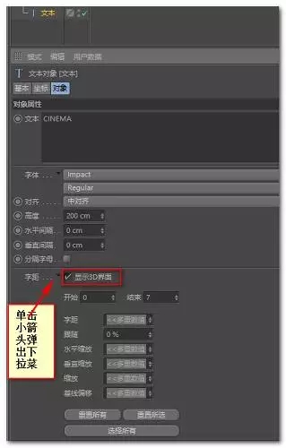 第五步:选中【文本】勾选对象属性中的【显示3D界面】对样条文字单个进行大小调整如图: