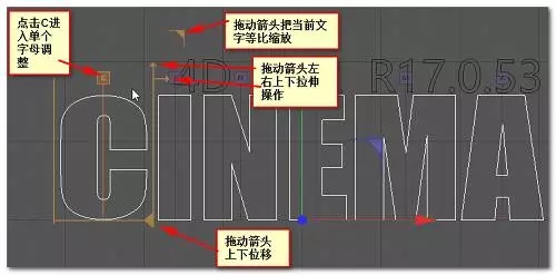 第六步:点击样条线上的C字母进入单独选中状态,并拖动手柄进行放大缩小,位移等操作如图: