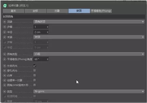 第十二步:选择【挤压1】调整封顶属性 改为【圆角封顶】,相关的封顶选项和类型可以去点击试试不同的效果如图: