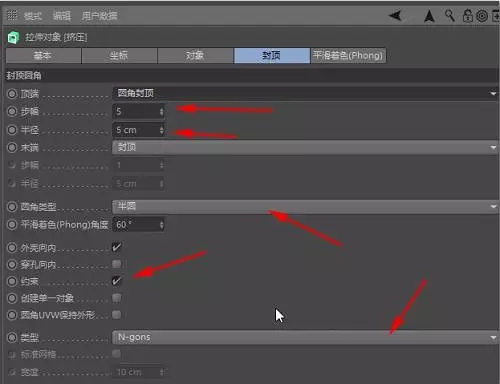 第十三步:选择【挤压】调整封顶属性 改为【圆角封顶】,箭头指示的选项都去调整下看看呈现的效果,参数如下