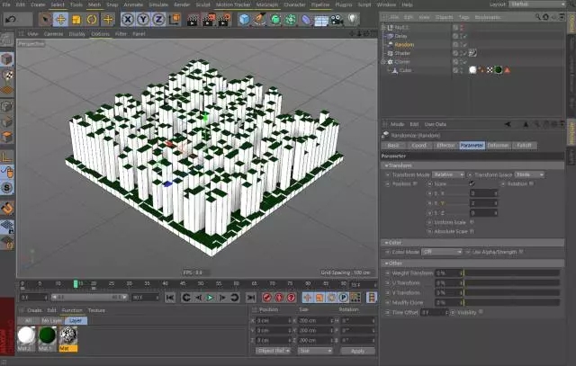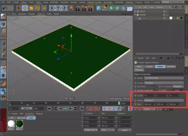 第三步:建立MoGraph克隆对象,选择矩阵阵列模式,按照图示的参数制作无缝的立方体阵列。