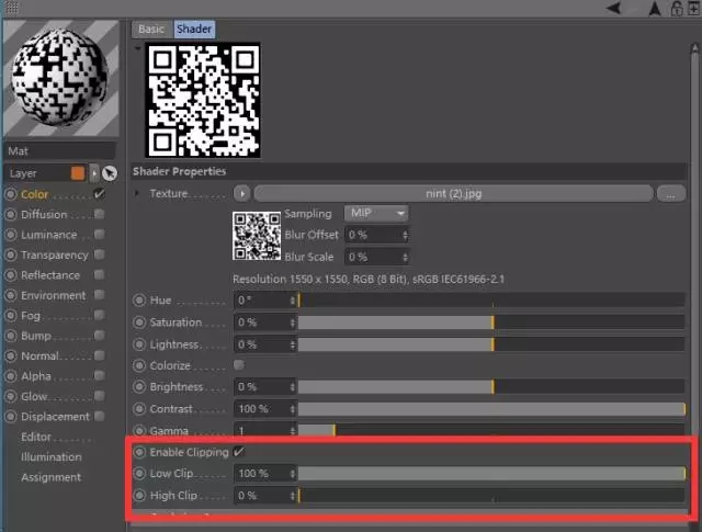 第四步:新建一个材质在颜色通道中载入二维码图片,因为要通过图片控制立方体阵列的状态,白色是起作用黑色是不起作用,这里可以如图使用滤镜做黑白反向,或者你在PS里直接黑白反向二维码图片也行。