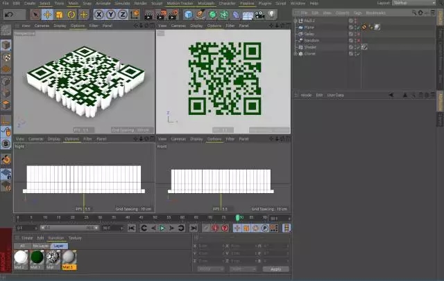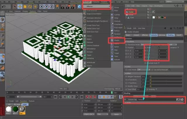第五步:给克隆对象一个Shader效果器,把上一步建立的材质给到效果器,如图设置让Shader效果器通过材质控制立方体阵列的高度尺寸,这时你的二维码就变成立体的啦。
