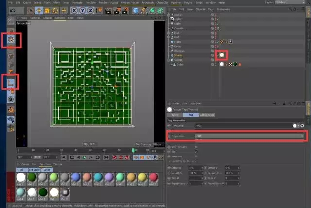 第六步:注意,将材质标签的投射模式改为Flat,然后要同时进入纹理编辑模式和轴心编辑模式,将这个纹理正好匹配到立方体阵列的大小。