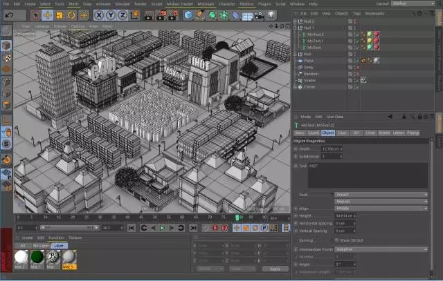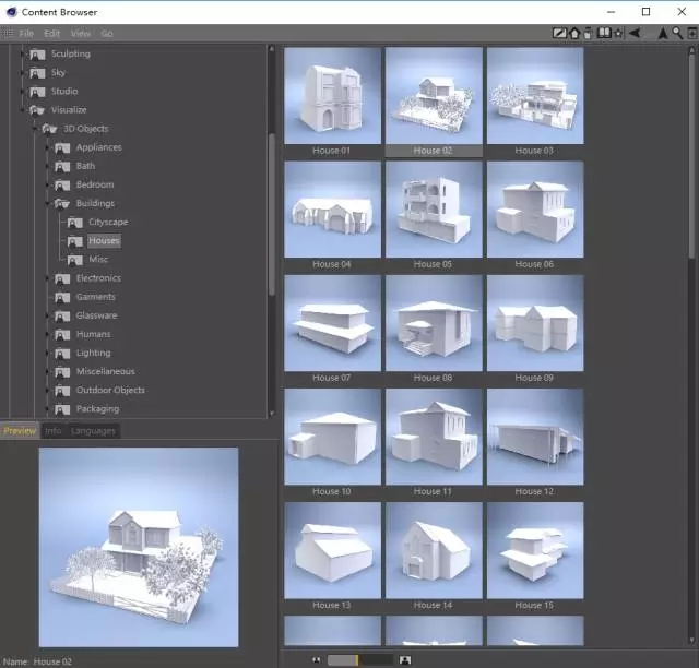 第九步:Ctrl+F8打开内容浏览器,如图找到C4D自带的建筑模型,按照你的想法和设计摆放场景吧,当然你也可以自己建模啦。