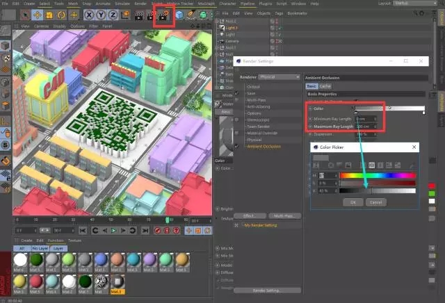 第十八步:打开渲染设置,在后期效果里载入一个AO效果,如图设置加深柔和的阴影效果,注意把默认的黑色调到深灰色,目的是避免二维码部分的阴影颜色太深,会导致二维码的对比度不够无法识别。另外在这里我给地面画了街道的贴图,你们可以根据自己的能力自己做。