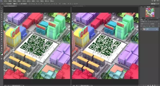 第十九步:渲染出图,到PS里根据自己的喜好处理一下色调,这里要重点调整二维码部分的明暗对比度,这里我提亮了阴影并加深了顶部的颜色,你们在调的时候可能要用手机不断尝试多次,记得在不丢失立体感的前提下尽量拉大二维码顶部和周围的亮度差,如图左右是我的调整前后比对。