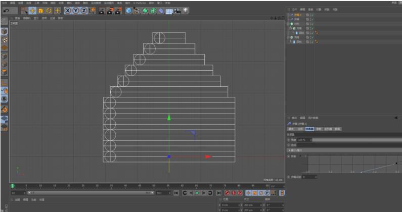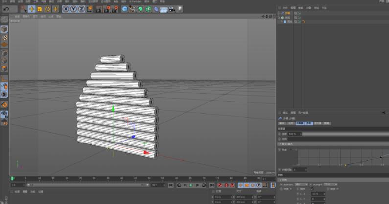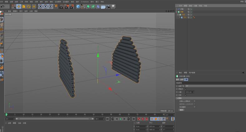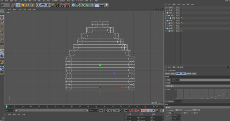 第三步:给克隆添加一个对称生成器,对称镜像平面为XY,复制克隆,圆柱轴向改为+Z,坐标归零后,给克隆添加一个步幅效果器,关闭缩放打开位置,改变位置的X轴直至如图所示。