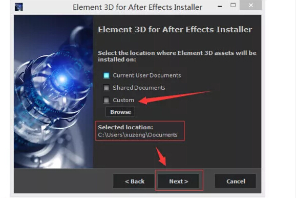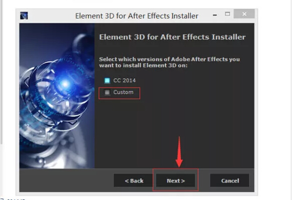 2、这里插件安装程序会默认检测到你安装过的AE版本,如果是绿色版或者是没有检测出来,可以选择“Custom”自定义路径(参考路径:D:Program FilesAdobeAdobe After Effects CC 2014Support FilesPlug-ins),然后点击“NEST”下一步。
