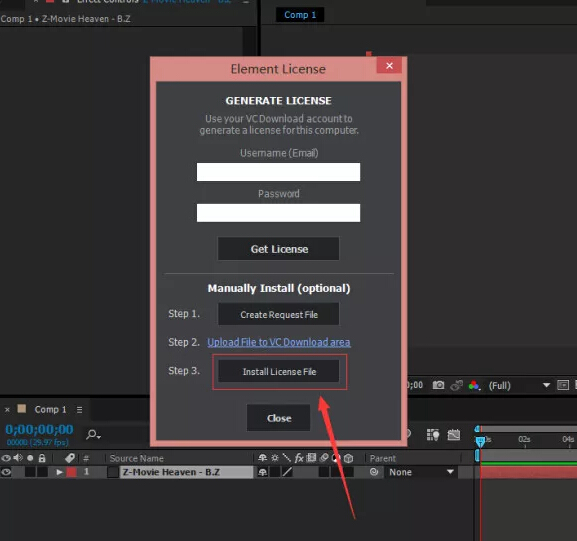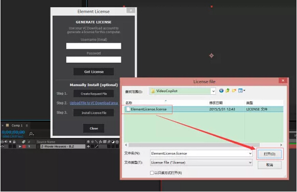 5,现在我们要开启AE进行注册破解,开启AE后新建一个固态层添加E3D插件,然后它会跳出一个注册的窗口,这里和之前的注册方式不一样,这次直接点击第三步”Step 3 : Install License File“带出注册文件,选择刚才复制在AE插件下面的”ElementLicense.license“文件,破解完成,可以使用了。