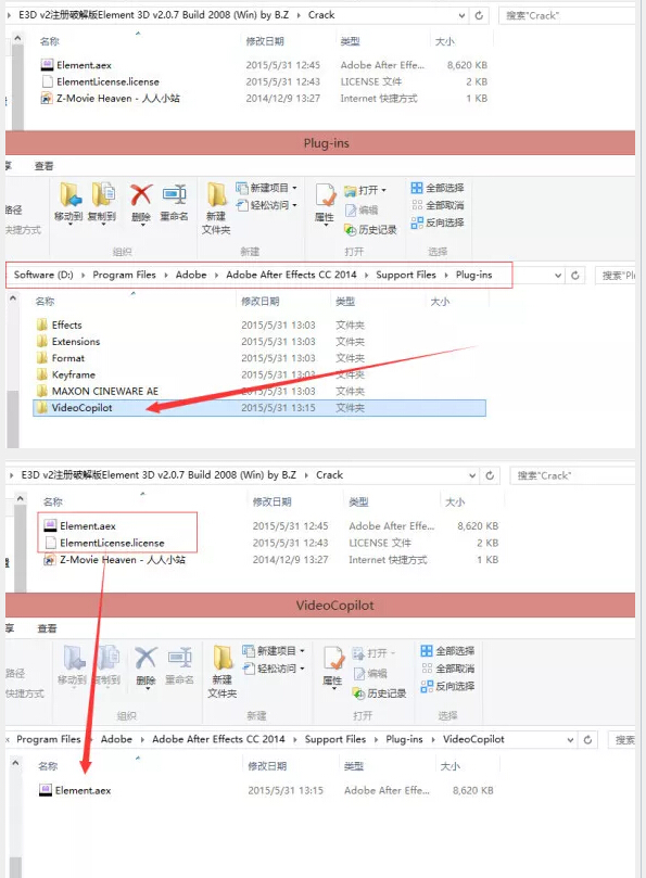 4、安装成功后,接着我们把“Crack”里面的文件替换掉AE插件目录下的"Element.aex",注意,最好把”ElementLicense.license“文件一块复制进去,这个文件是注册信息来着。