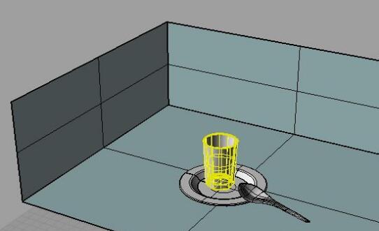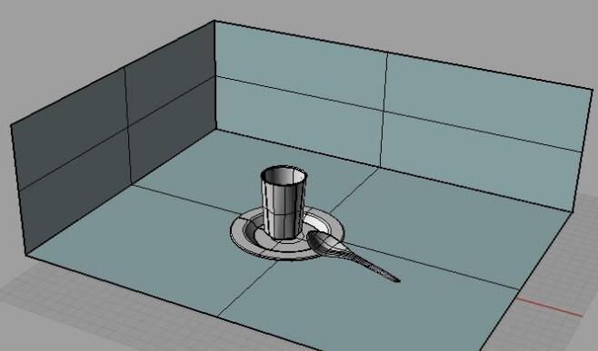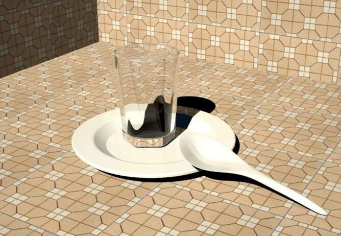 教程这里画一支勺子、一个碟子、一个杯子,如图所示。图中为什么要画一个如墙角的三个面呢?这是一个小技巧,既可以作器具下面的依托,另外遮住背景。