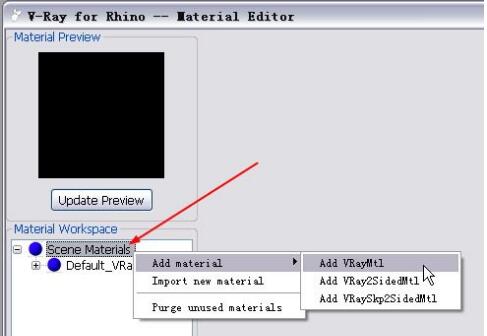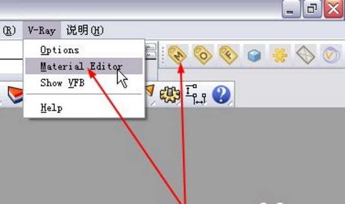 点击Vray For Rhino工具条上的“M”,或者如图点击菜单。
