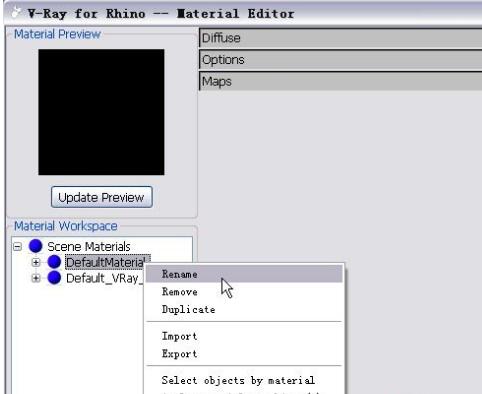 这时图中新增了一个“Defaultmaterial ”的材质项,然后把鼠标移到上面点右键,然后点“RENAME”,即重命名。这里我命名为“BEIZI”(杯子)。虽然这一步不是必要的,但为了清晰易读,还是重命名为好。