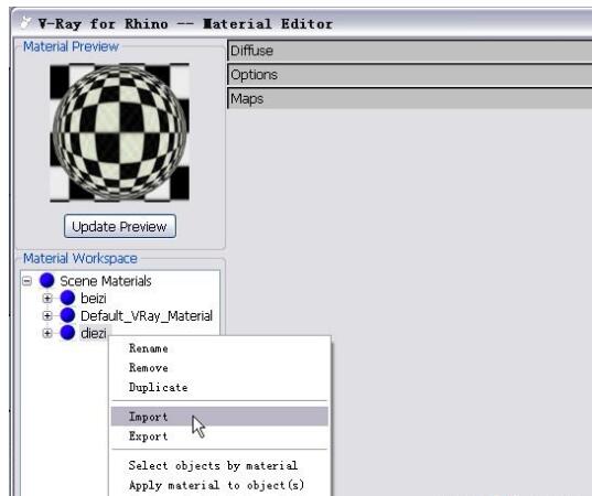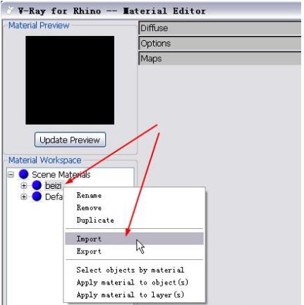 第六步:然后在鼠标右键菜单中点“IMPORT”,它的意思是从其它地方调入一个“材质”进来。