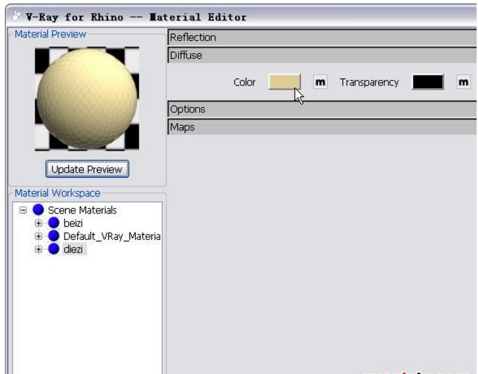 第十二步:刷新材质预览框,观察到这个磁器材质显得黄色过了。点“DIFFUSE”(材质漫反射)下的“COLOR”(颜色)。