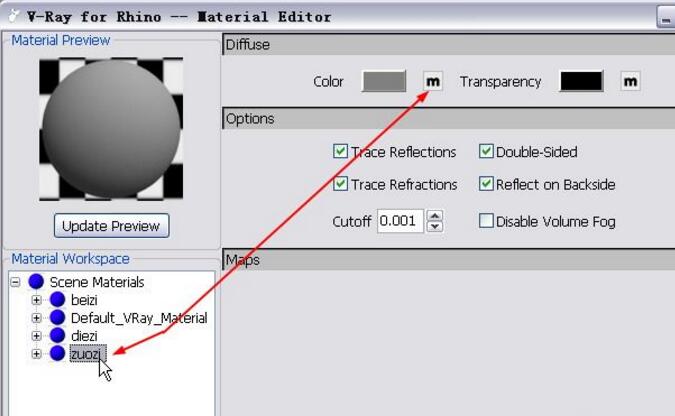 第十七步:同前的方法,新建材质,命名为“ZUOZI”(桌子)。点点“DIFFUSE”(材质漫反射)下的“COLOR”(颜色)旁边的“M”,这个“M”通常是指这里可以插入图片进来。