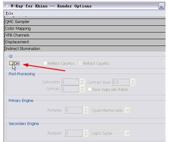 第二十五步:打开对话框中的这一项卷展栏,去掉“GI”下“ON”的勾勾。“GI”的意思是全局照明,它的调整很复杂,这里干脆先不用,以求尽快上手。