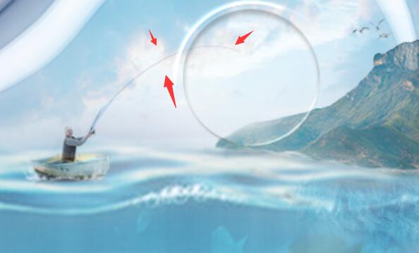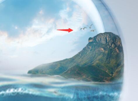 16、再次拖入水面素材,调整不透明度,然后隐藏不必要的部分,作为水面和山之间的浪花。