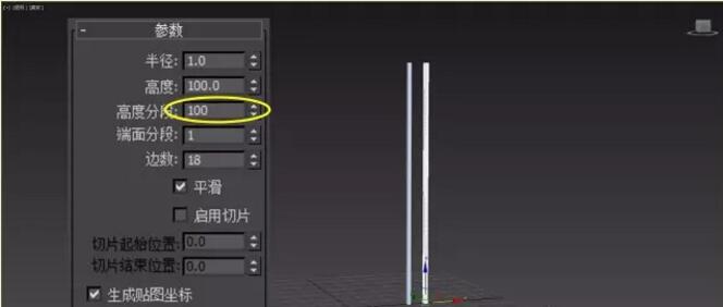1. 在视图中创建两个圆柱体,半径1.0,高度100.0,高度分段100,间距设为8.0。