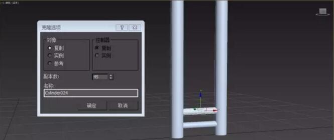 2. 在两圆柱体之间创建一垂直的圆柱体连接。按快捷键W,鼠标移至Z轴使其呈亮黄色,按住Shift后点击往上拖动适当距离,在克隆选项窗口中设置副本数为45。