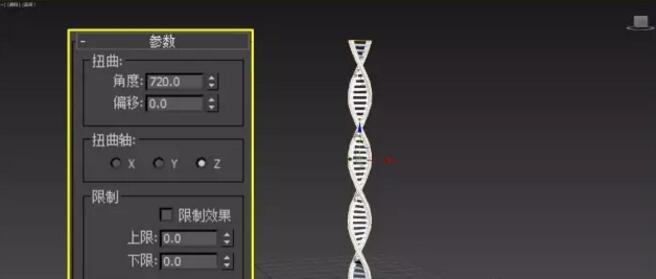 3. 选中所有对象,点击修改器>>参数化变形器>>扭曲,在参数栏中设置扭曲角度(720.0)和扭曲轴(Z轴)。