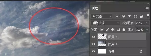 接着找一个星云的图片素材,黑色背景会比较容易操作,然后拖到画布中,调整合适的大小,图层模式改为颜色减淡,不透明度为25%。