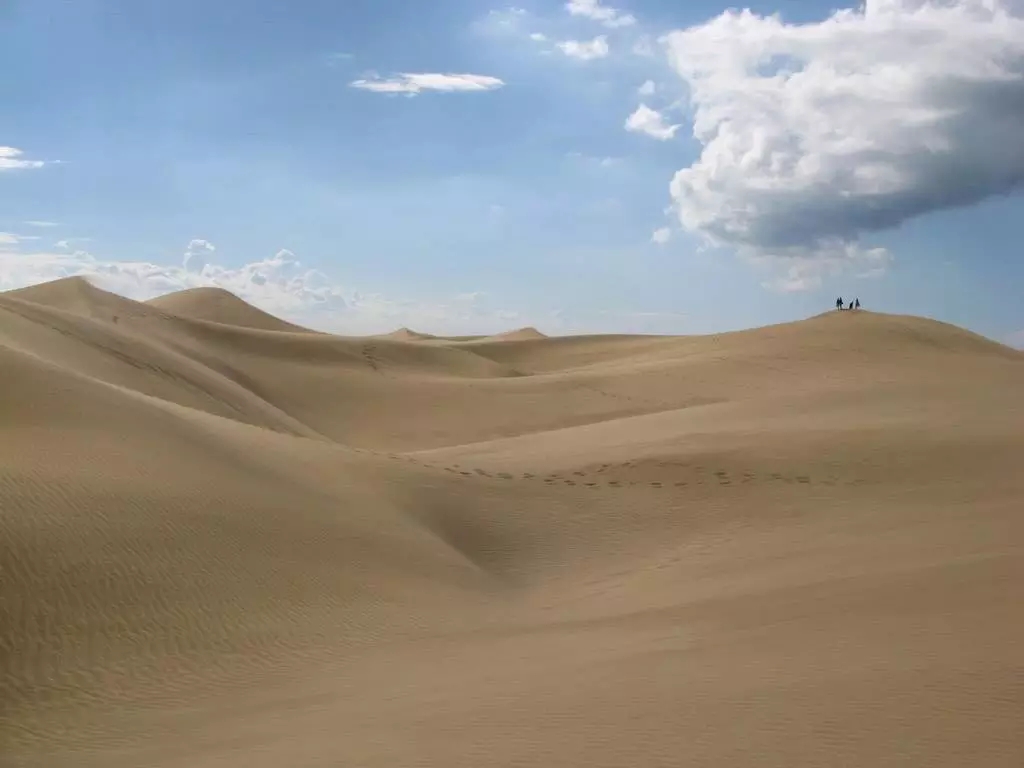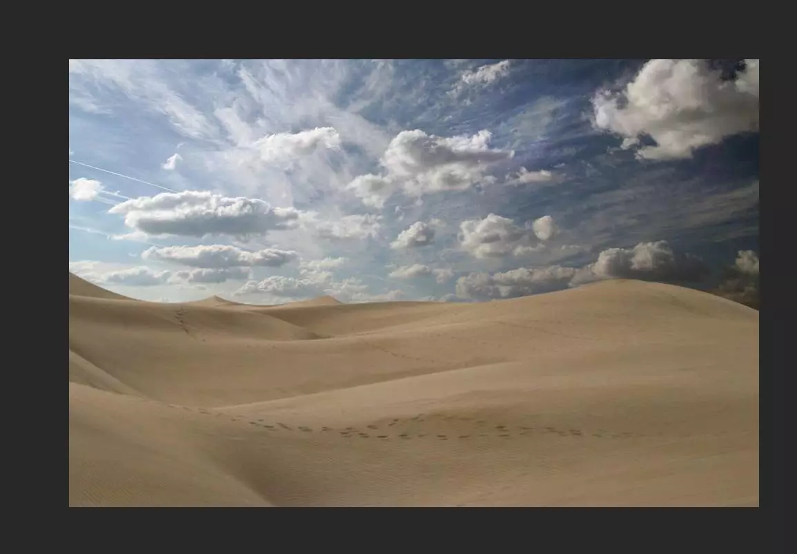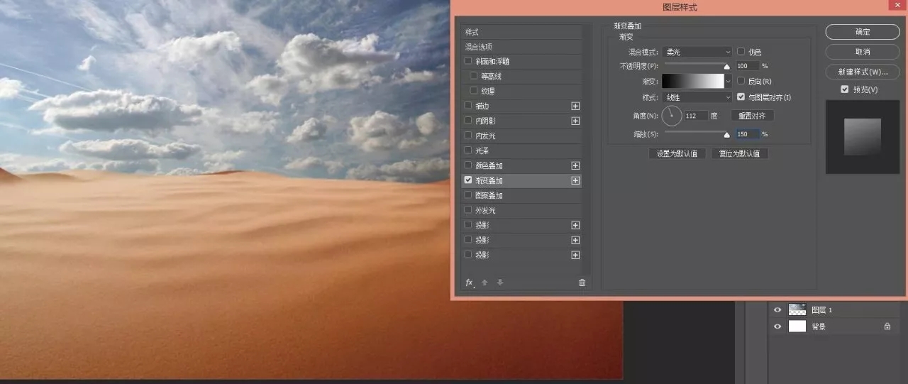 之前的沙漠图片起伏较大,现在再找一张沙漠图片,相对平缓一些,然后依然是把沙漠部分抠选出来,并添加一个渐变叠加。