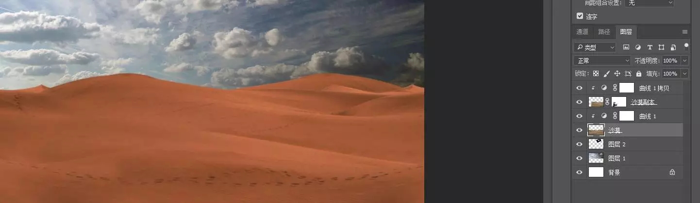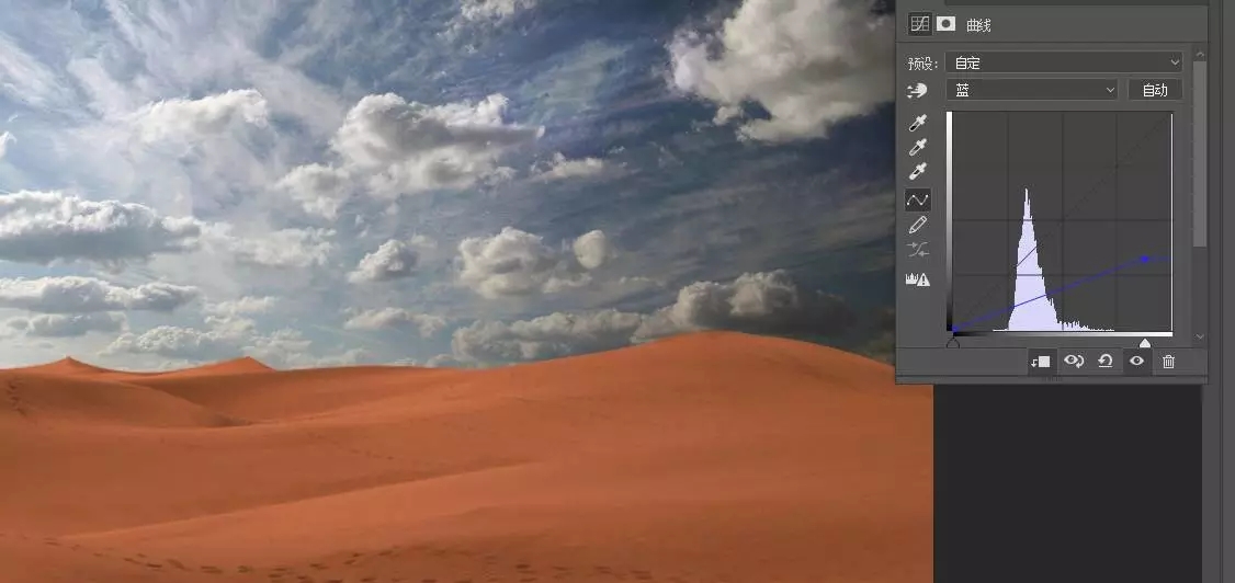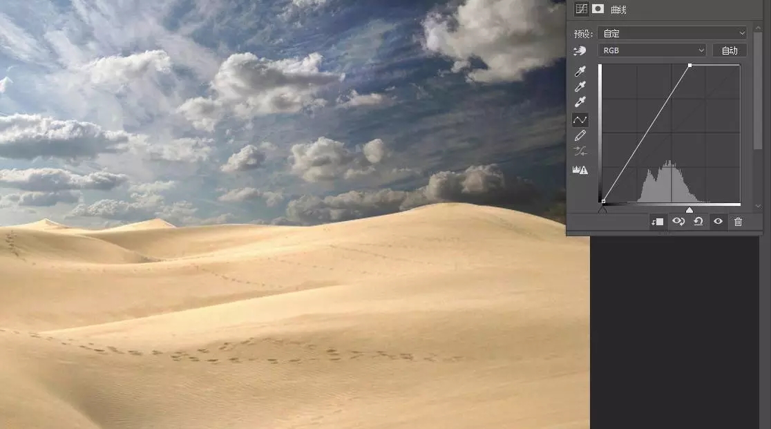 第四步:对沙漠进行调色处理,这里主要用曲线调整沙漠图层