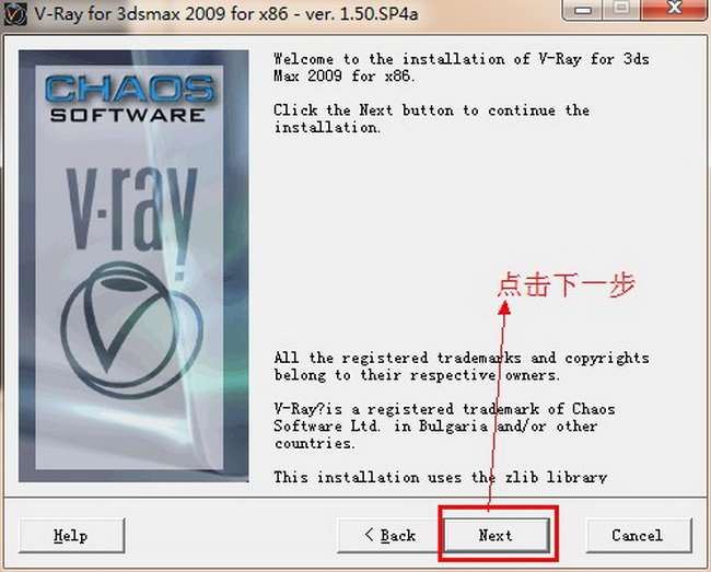 安装vray1.5-sp4 3dsmax2009 32位英文版,双击打开vray1.5-sp4 3dsmax2009 32位英文版安装包。