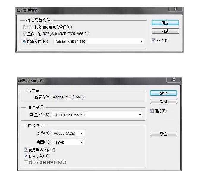 a、如果照片配置内容是中间选项“工作中的RGB(W):sRGB IEC61966-2.1”需要调整的步骤为:(编辑)-(指定配置文件)-“配置文件(R):Adobe RGB(1998)”-(编辑)-(转换为配置文件)-目标空间“配置文件(R):sRGB IEC61966-2.1”。