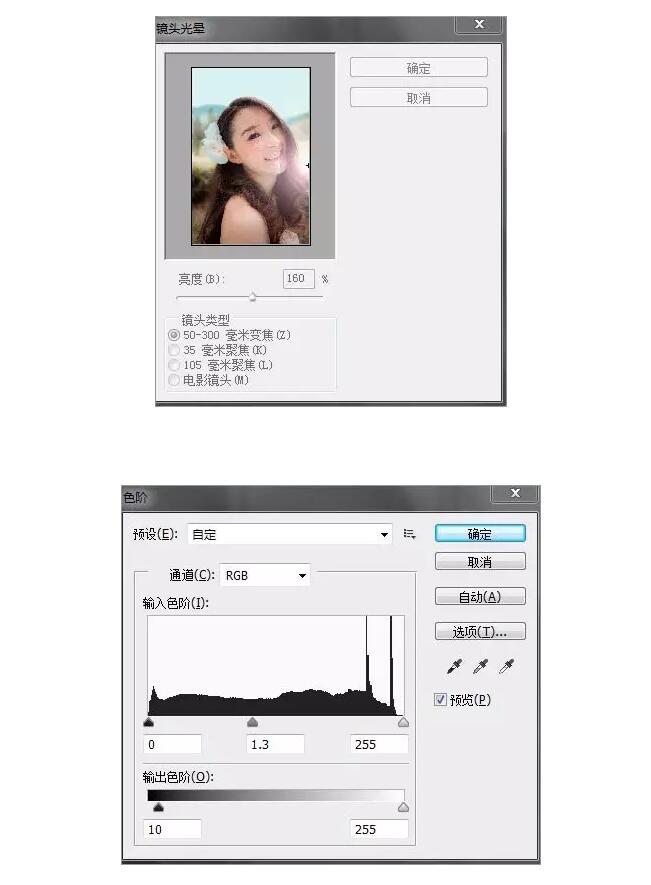 复制一层,添加(镜头光晕)效果增加照片内容并对人物脸部较深的阴影做一定掩饰,使用(橡皮擦)工具擦除片中(镜头光晕)带来多余的亮点和光晕;打开(色阶)增加加玛值以及减少暗部输出色阶。