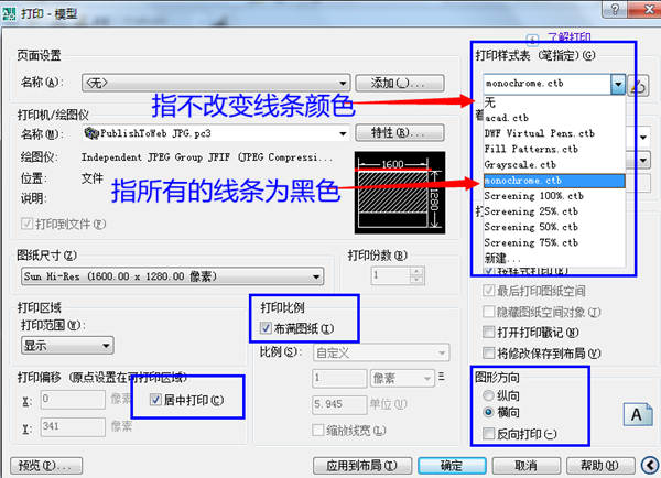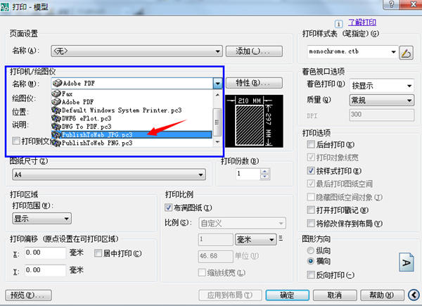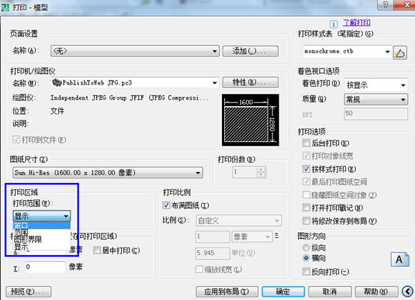 2、选择JPG打印后,会弹出选择窗口,一般小图选择默认就行,如果图纸比较大,且比较详细的话,建议选择自定义,可以得到更加清晰的图片