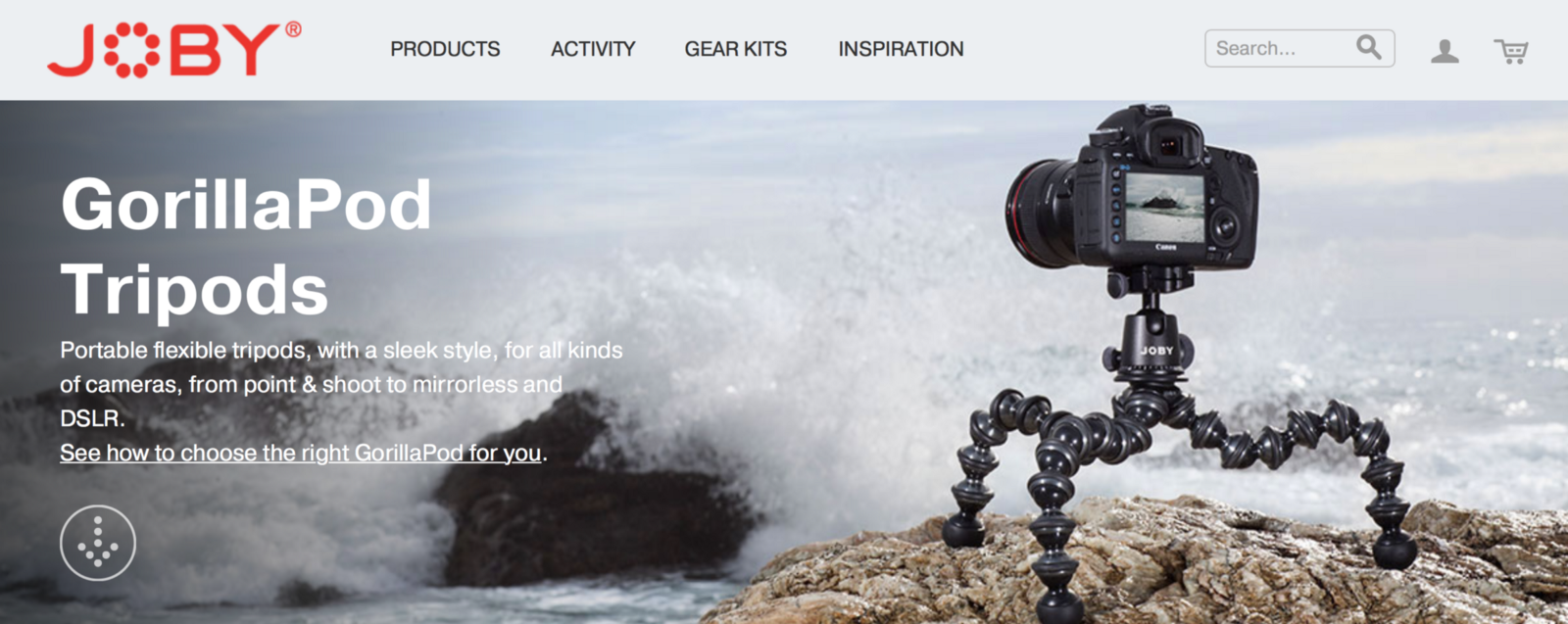 根据环境和使用场景来展示产品是电商网站常用的机巧。而实际的数据也表明,这样的图片拥有着极高的转化率。举个例子,下面所展示的 GorillaPod 就将产品置于实际的使用场景中,给予用户真实的使用体验。灵活的三脚架在整个图片中作为焦点而存在整个首图的设计富有创造性,信息和内容的传递也颇为高效。