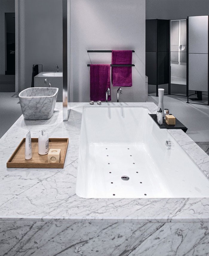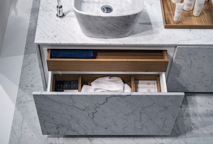 随着国民经济的快速涨长,人们的生活也越来越好,对生活质量的要求也越来越高了。不只是客厅、卧室的装修,就连浴室的设计装修也要求非常高,下面这个浴室可以让你看到奢华的极简设计。名贵的石板材质柜子、洗脸池、木制托盘等等,整个浴室的用色非常明了,白色的墙可以让整个浴室特别明亮大气。