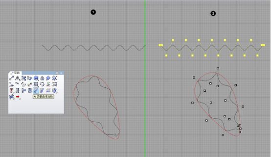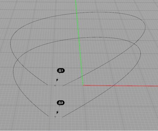 接着如下图,同样是通过点和曲线的组合运用,来快速生成这样的曲面。大多人习惯与曲线与曲线来放样,容易遗漏曲线和点的搭配运用,如下图,绘制好如下一组曲线,并放置好1和2两个点。
