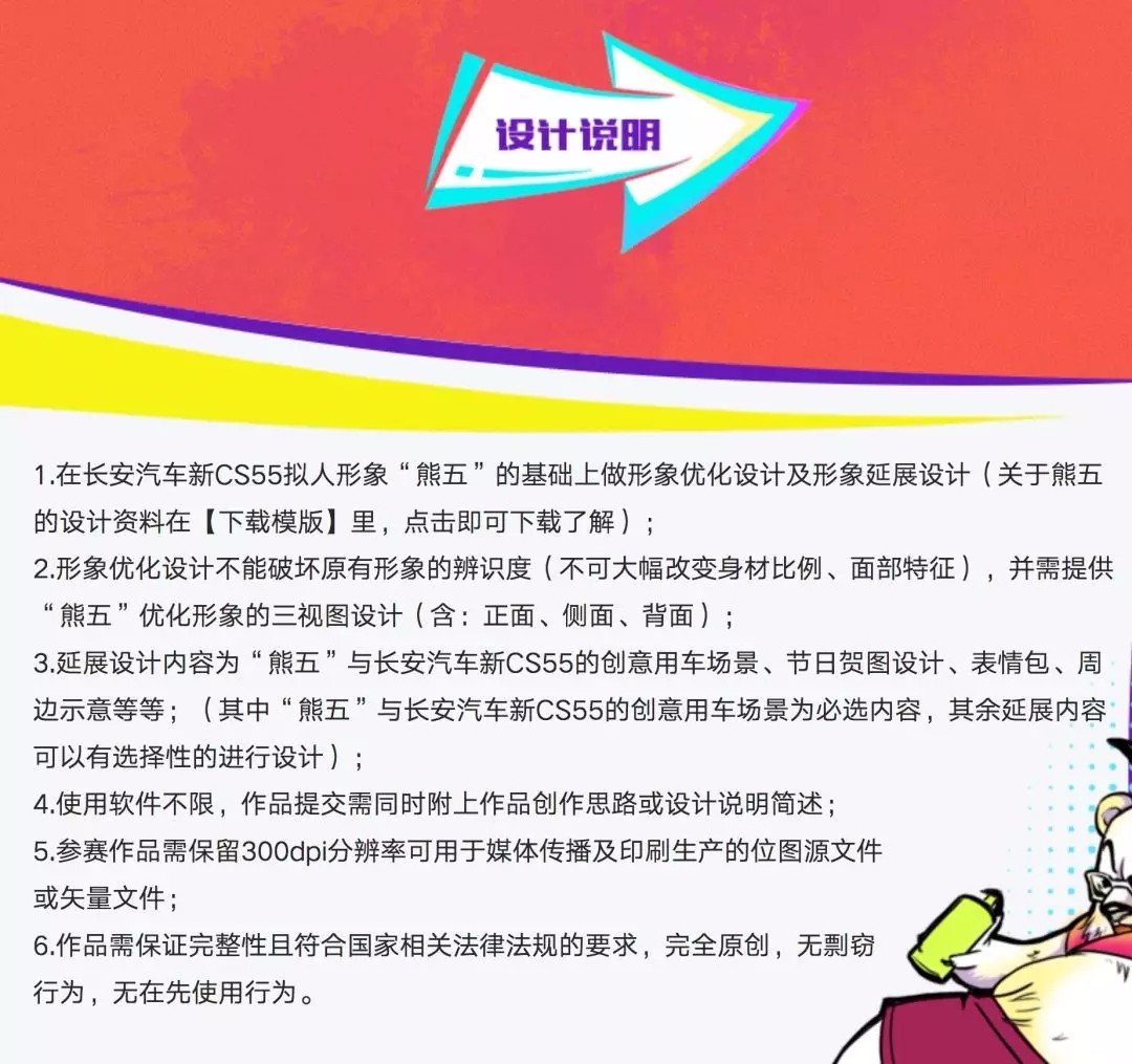 1.在长安汽车新CS55拟人形象“熊五”的基础上做形象优化设计及形象延展设计(关于熊五的设计资料在【下载模版】里,点击即可下载了解);