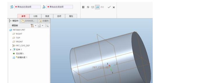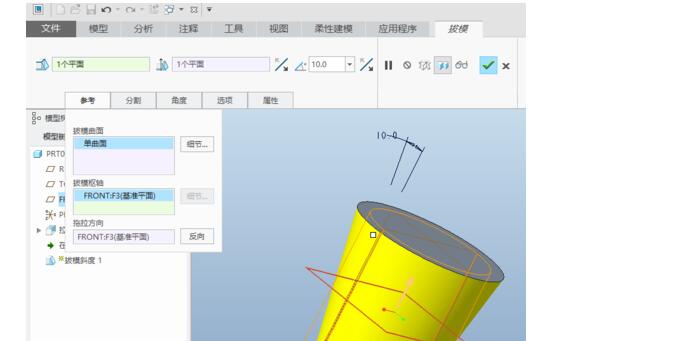 在“参考”中,选择外圆柱面为拔模曲面,front面为拔模枢轴