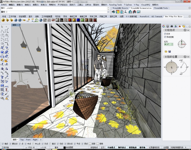 即时可见的阴影是su最大的优势之一,这一特点在su很早开始就有了,但是即便是3dmax也是最近的版本才得以实现。而在rhino5.0的版本中,虽然不如su那么便捷,但是经过人工设置之后,终于可以较好的实现阴影的显示,并且rhino的太阳是可以被vary直接拾取的,你都不需要在添加vary太阳了。更不需要一遍一遍的在rhino中去渲染来查看阴影角度的位置是否满意。