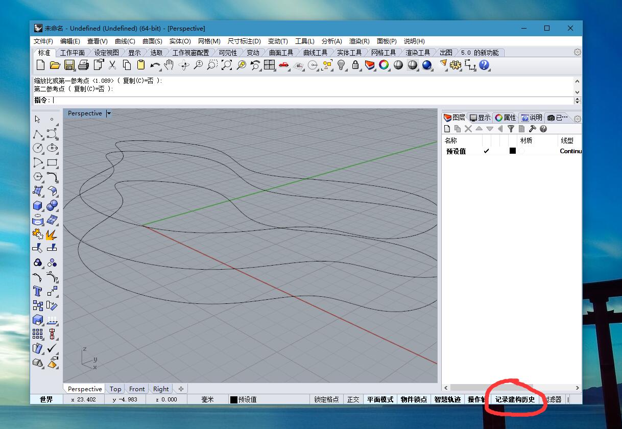 在画好放样的曲线后,先点击一下最下方的“记录构件历史”,然后再进行放样操作,这样的话,在Rhino曲线放样成曲面后,可以通过微调原曲线来微调整曲面的效果,方便我们进行后期操作。