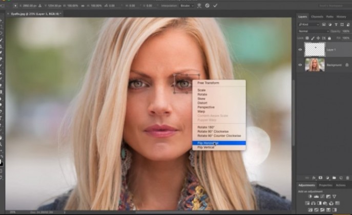 直接把眼睛拉过去是不行的,当然要把图像水平翻转,看上去才自然。水平翻转的步骤:按照快捷键Ctrl+T,鼠标点右键,选择水平翻转。