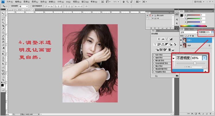 取消选区,得到美白效果,但是为了让画面里皮肤更有质感,通常会把调整过的图层透明度降低,这张图片我选择65%的透明度。